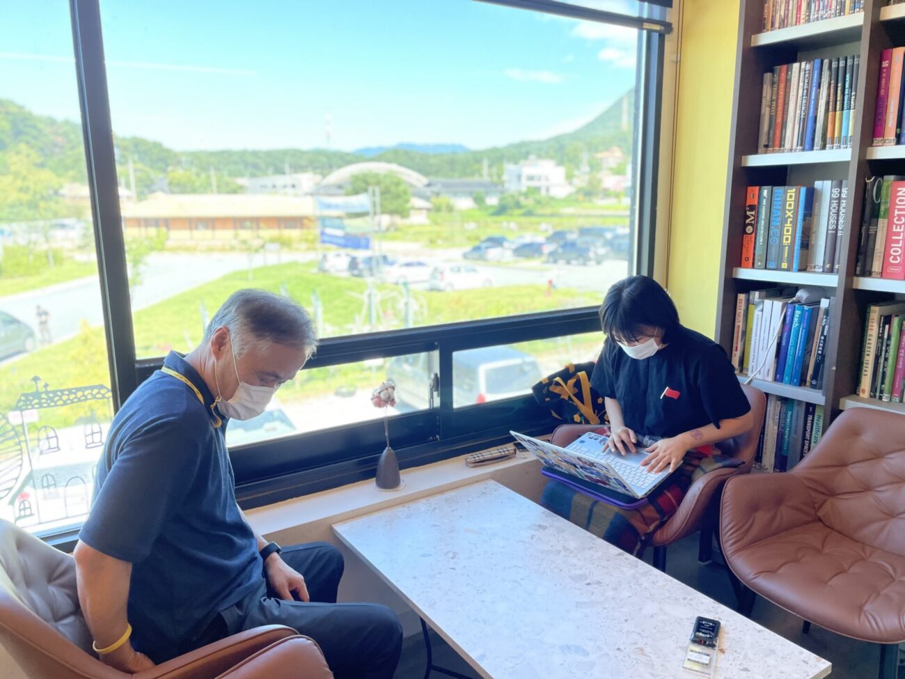 ▲인터뷰 현장 사진. 옆면은 통창이고 뒷벽은 책장인 카페에 탁자를 사이에 두고 마주보고 있다. 왼쪽에 김주묵 활동가가, 오른쪽에 취재기자 이바다가 앉아 있다. 취재기자는 노트북으로 인터뷰 내용을 받아 적고 있다.