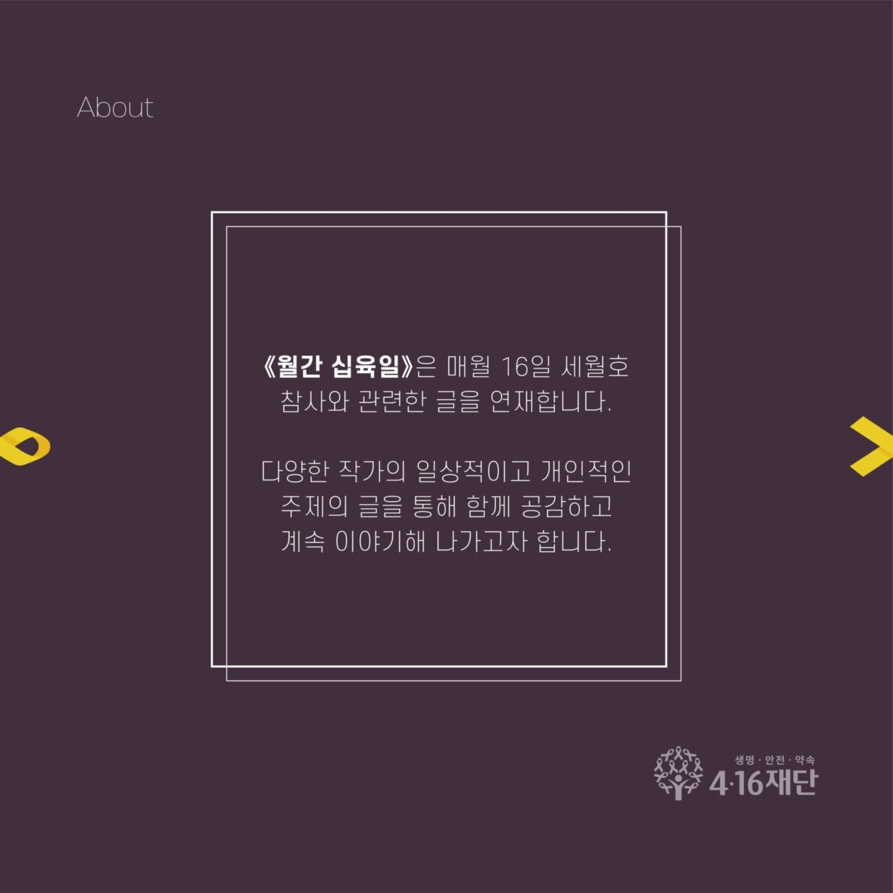 《월간 십육일》은 매월 16일 4.16세월호참사와 관련한 에세이를 연재합니다. 다양한 작가의 일상적이고 개인적인 주제의 에세이를 통해, 공함하고 계속 이야기해 나가자고 합니다.