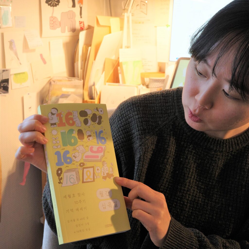 책 속에는 5컷의 도비라 그림이 있는데, 남겨진 사람과 기억하는 사람들의 모습들을 담고 있어요. 16이라는 숫자를 방 안에서 홀로 마음에 안고 지내다가, 16이라는 숫자를 여러 사람들과 함께 기억하고, 다 같이 봄으로 걸어가는 과정을 그렸어요.