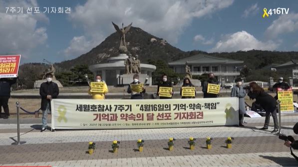 3.22 오전 11시 청와대 분수대 광장에서는 (사)4.16세월호참사 가족협의회와 4.16연대는 4.16세월호참사 7년을 맞이하며 세월호참사 진상규명과 안전사회 건설을 향한 피해자 가족과 시민들의 의지를 모아 3월 22일(월)부터 4월 18일(일)까지 추모의 달을 선포하고, 기억·추모에 대한 기조와 활동 계획을 발표하는 기자회견을 개최하였습니다.
