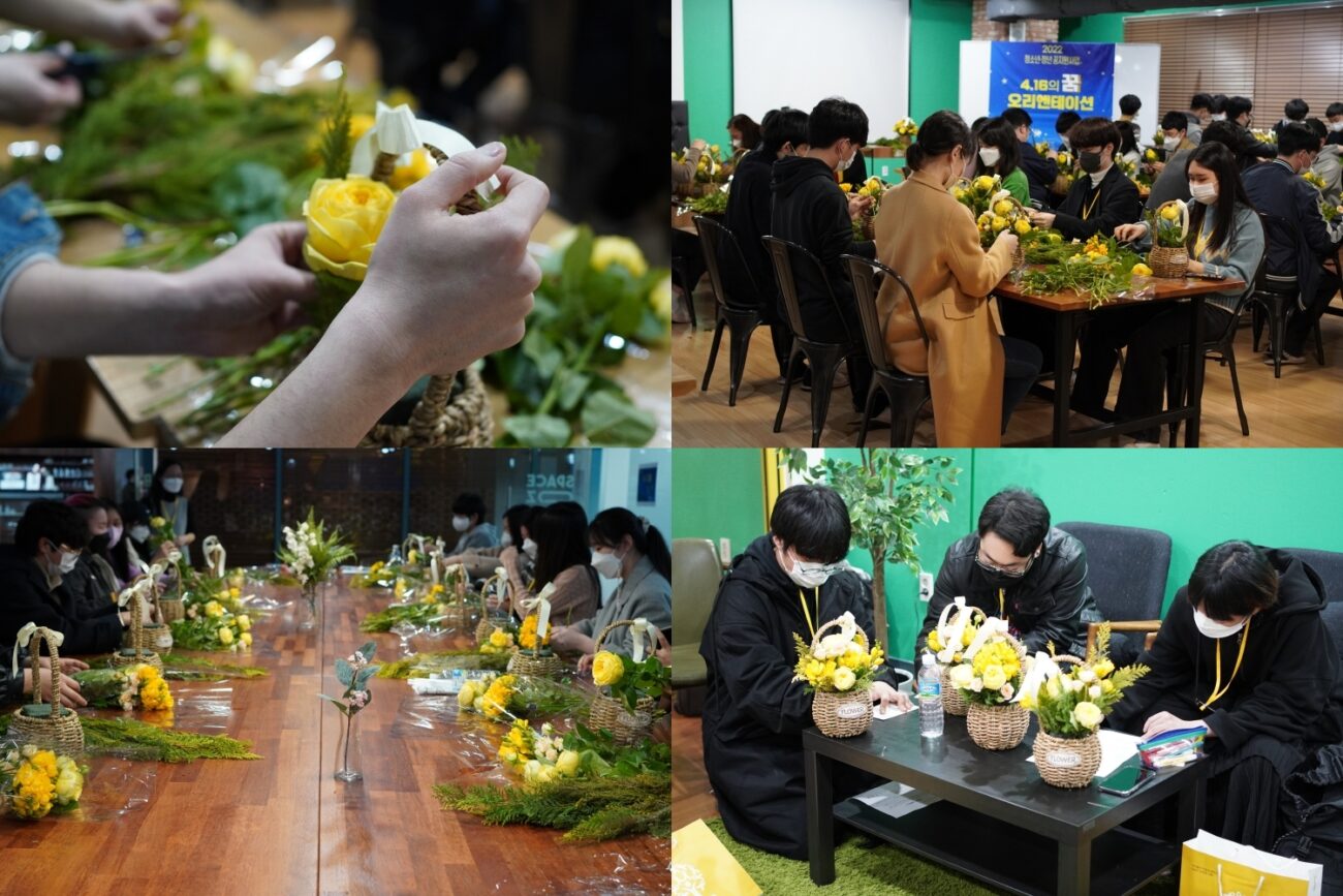 코로나 19상황으로 오랜만에 대면 활동이 진행되었습니다. 올해 꿈쟁이로 선정된 것을 서로 축하하는 의미와 세월호 참사 8주기를 기억하는 의미의 노란색 꽃바구니 만들기 시간을 가졌습니다. 축하와 응원의 메시지를 적어 노란색 꽃바구니를 교환하였습니다. 오랜만에 받아보는 축하와 꽃 선물에 나도 모르게 미소가 지어집니다.