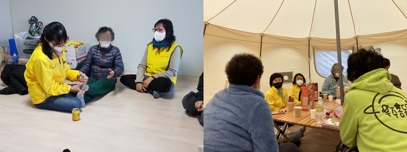 코로나19의 상황도 고려해야 하기에, 이번 구호소는 수련원의 각 객실로 산불피해자가 분산되어 있었습니다. 그렇다보니 대부분 고령인 산불피해자들의 몸과 마음이 괜찮으신지, 무엇이 더 필요하신지 일일이 묻고 확인하는 것이 쉽지는 않았습니다. 그래서 <더프라미스 국제재난심리지원단 이지스>에서는 함께 대화하고 마음을 나눌 수 있는 ‘사랑방’을 만들어서 세월호 엄마 아빠들과 함께 운영했습니다. 아픈 몸을 어루만지며 마사지도 해드리고, 가슴 속 진솔한 이야기도 나누면서 그렇게 서로가 서로에게 의지가 되고 도움이 되었습니다.