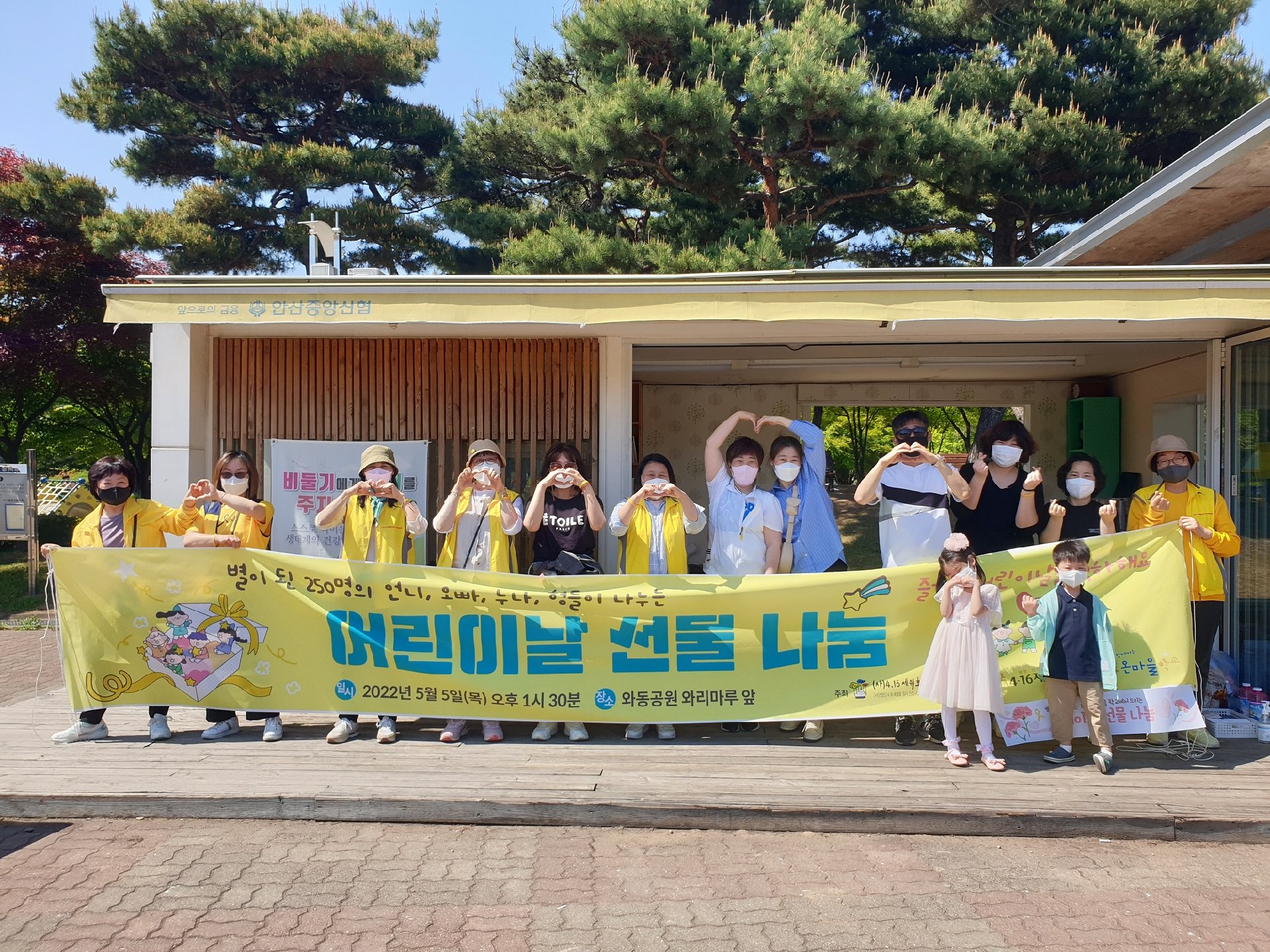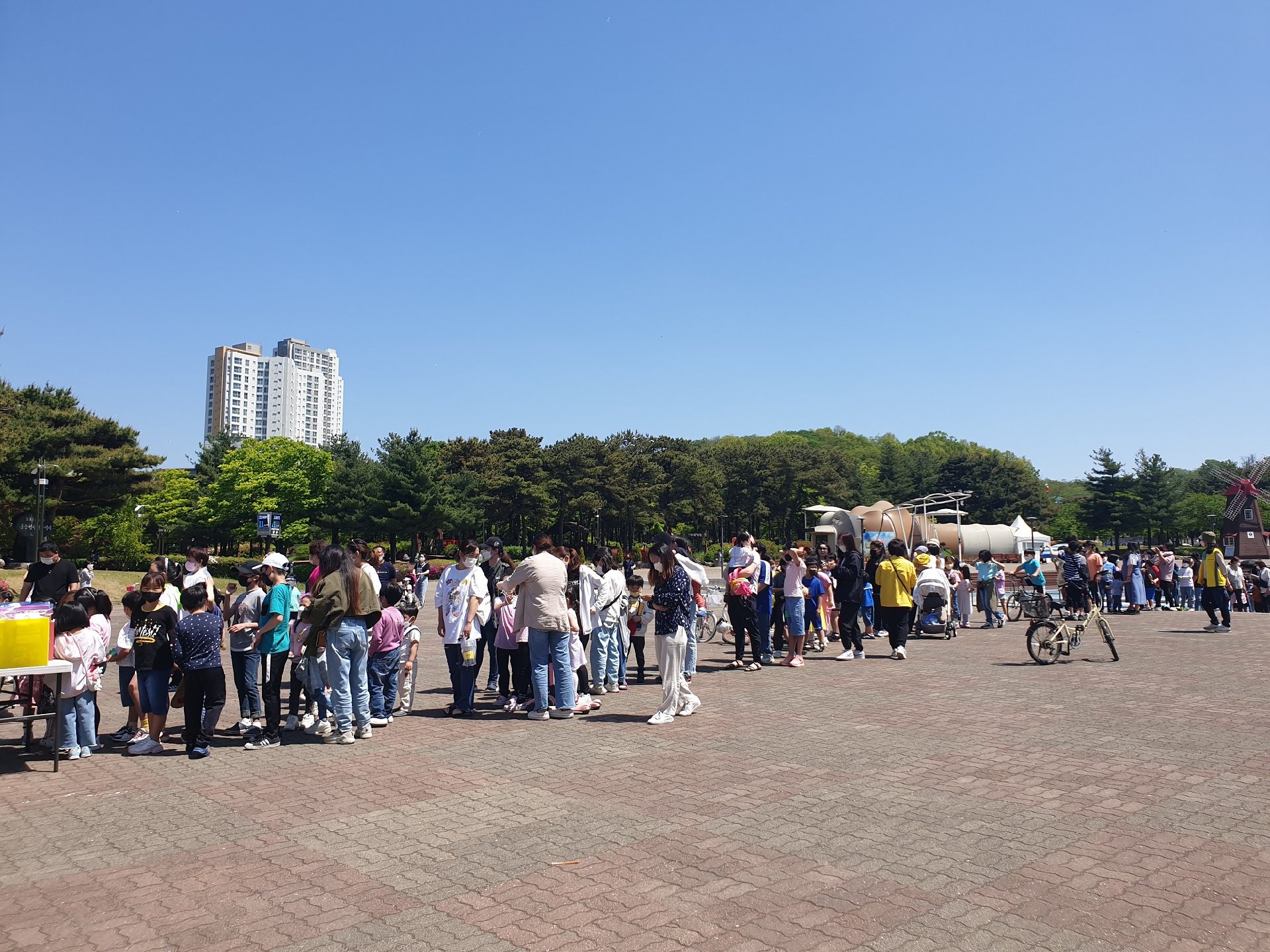 어느 때보다 화창했던 어린이날, 안산 와동 체육공원에 많은 아이들이 모였습니다. 선물 나눔을 시작하기 전부터 아이들이 모여들어 설레는 표정으로 자발적으로 줄을 섰습니다.