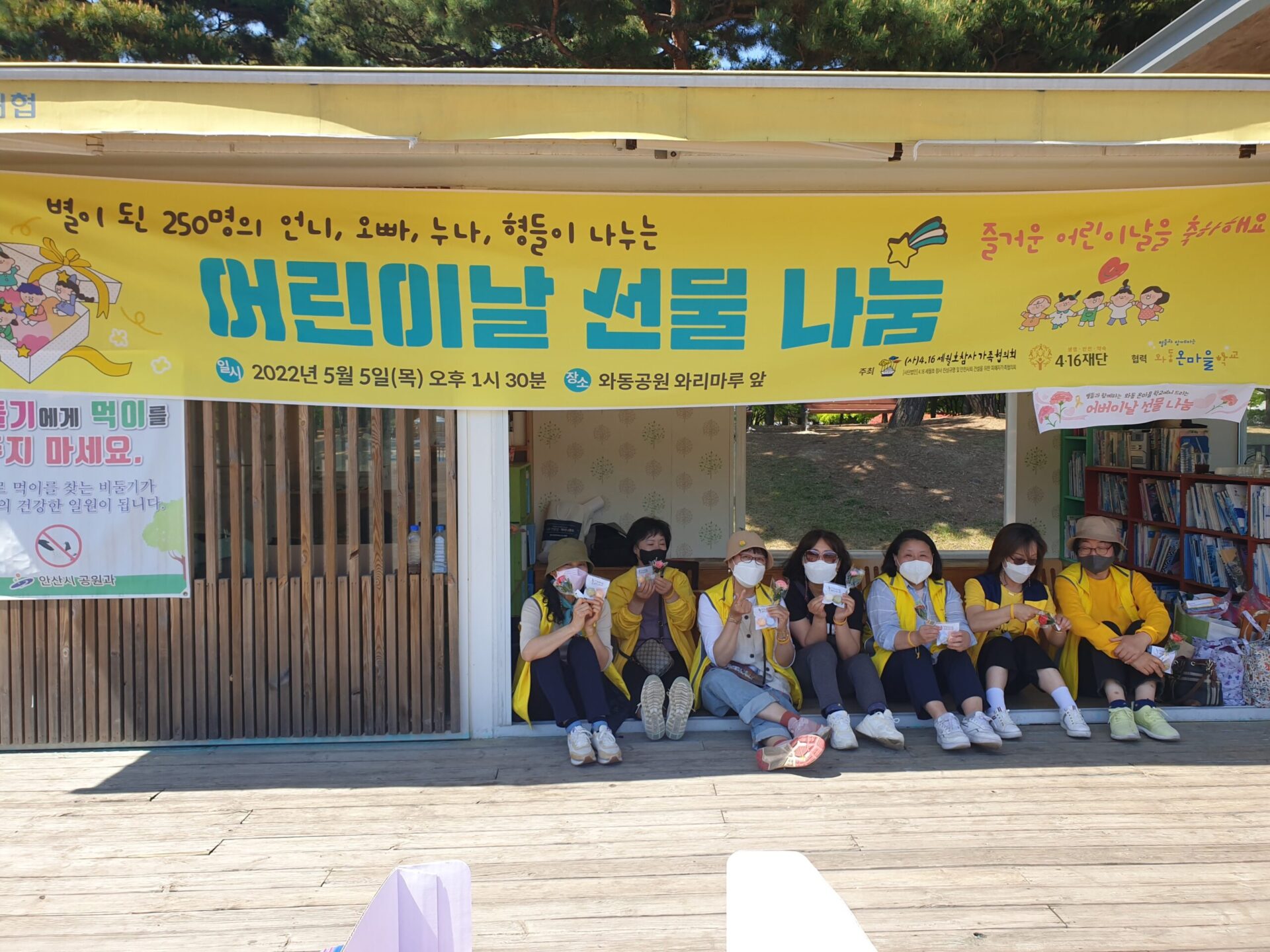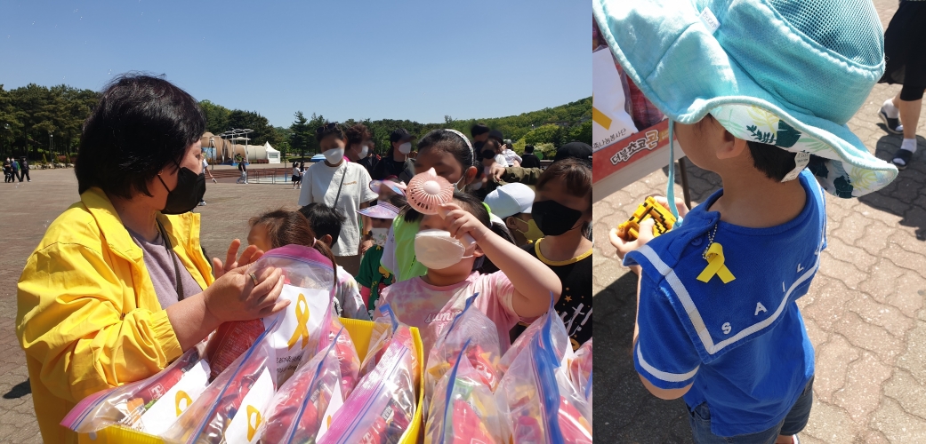 5월 5일 어린이날에는 안산 지역 어린이 250명에게 노란 리본과 함께 여러 가지 과자가 담긴 선물 꾸러미를 나누어 줬습니다. 선물 받고 좋아할 아이들의 모습을 상상하며 세월호 엄마들이 직접 고르고 정성껏 포장했습니다.