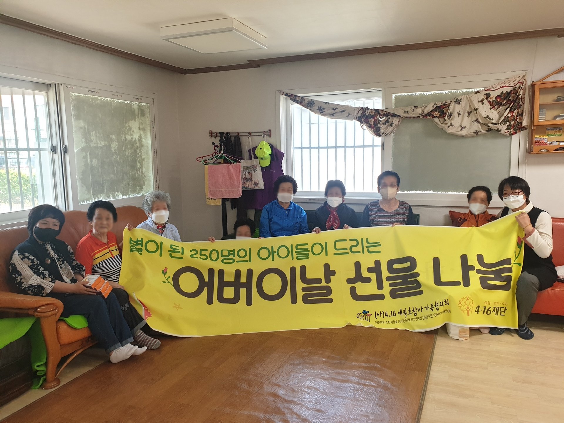 어버이날 선물 나눔에는 4.16봉사단 엄마 4명이 참여하여 고잔동 안식경로당, 화랑경로당, 명성교회 앞, 화랑경로당, 적금경로당, 아파트 경로당 등 6곳에서 진행되었고, 300명의 어르신들에게 선물을 전했습니다. 거동이 불편하여 집 안에 계시는 어르신에게는 직접 방문하여 전달 드리기도 했습니다.