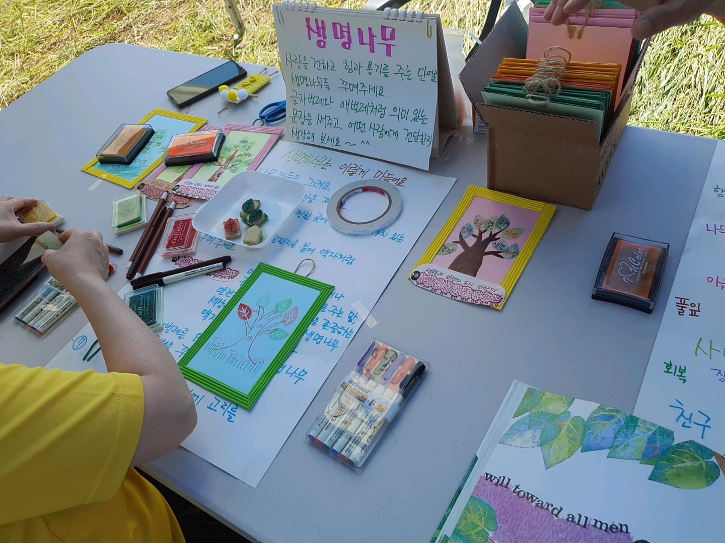 용기를 주는 단어를 종이에 기입한 후, 추가로 그 위에 나무 그림을 그려 액자를 완성하는 활동이었습니다.