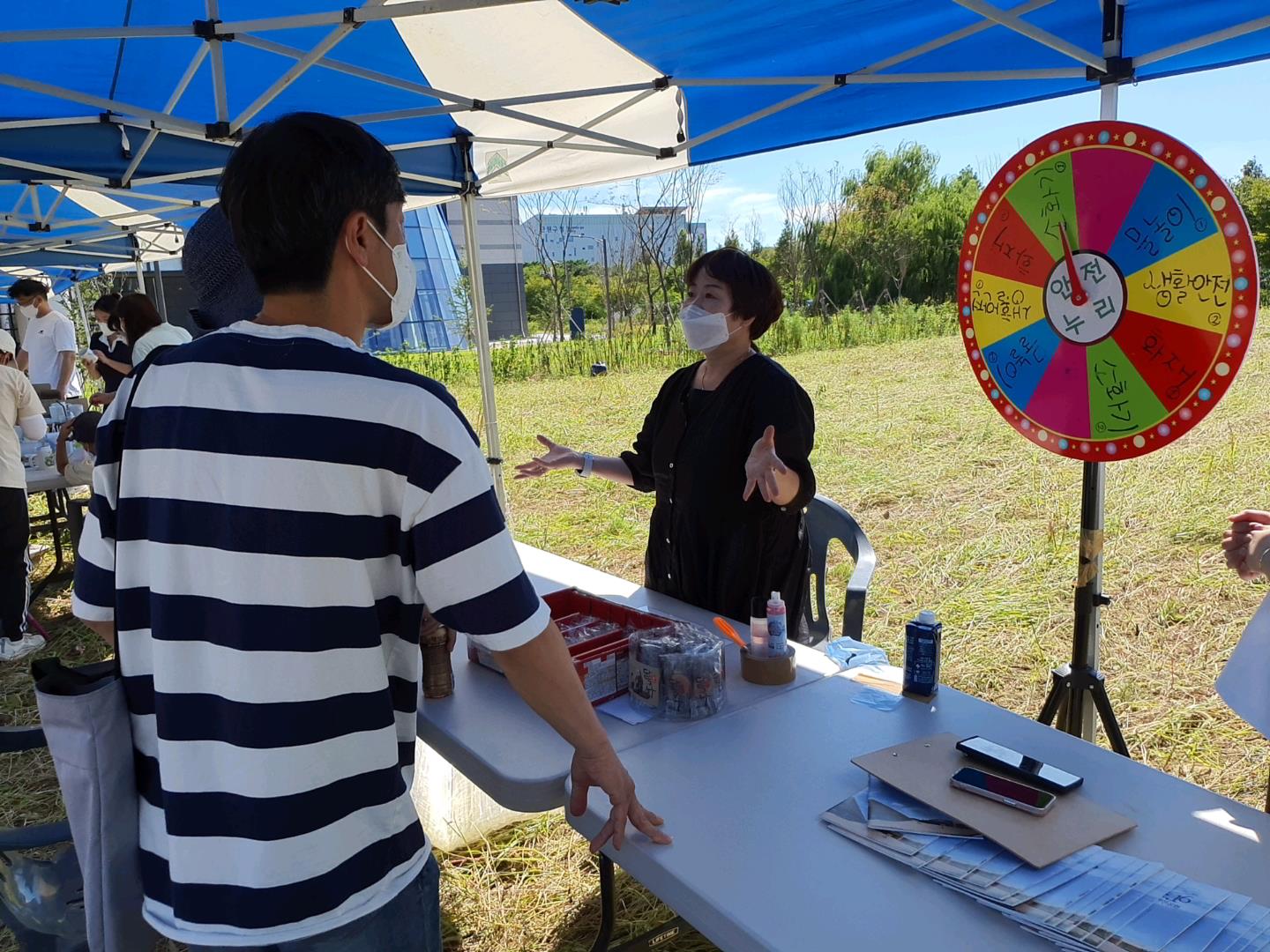 ㈜안전누리교육원에서는 물놀이와 생활안전, 화재, 소화기(기존의 분말 소화기 교체 주기 등) 등 4가지 분야 중 하나를 돌림판으로 선정하여 이에 관해 퀴즈를 맞추는 활동이 진행되었습니다. 맞춘 사람에게는 소정의 간식, 또는 노란 배가 그려진 그립톡을 증정하여 경품을 얻을 수 있는 현장이라 문화제의 흥겨운 분위기를 더욱 높이는 곳이었습니다.
