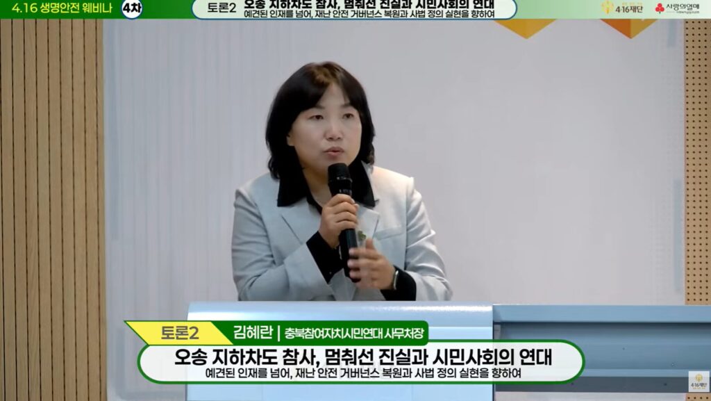 경기도 안산에 위치한 4.16생명안전교육원 미래희망관에서는 약 20명의 현장 참석자와 100여 명의 온라인 참석자들이 웨비나를 듣기 위해 모여 있었습니다. 재난 참사로 인해 떠나간 이들을 기억하기 위한 묵념으로 시작한 본 행사에는 4.16세월호참사가족협의회 김순길 사무처장을 비롯하여, 4·16재단 생명안전사업위원회 김겸훈 위원장 그리고 제종길 전 안산시장 등이 자리를 함께했습니다.