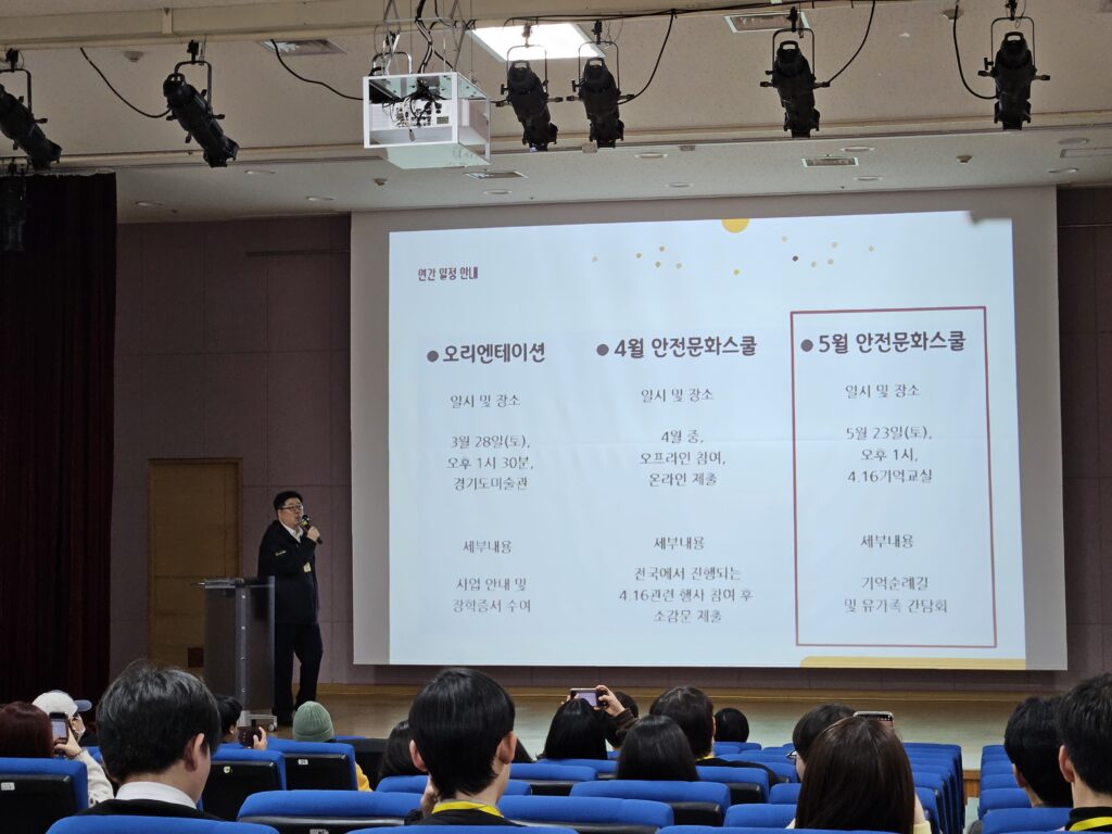 본격적으로 오리엔테이션이 시작되었습니다. 행사 전 묵념과, 경기도미술관 강당의 대피도 안내가 이루어졌습니다. 사소할지라도 안전을 지키는 가장 기본적인 교육임을 새겨봅니다.