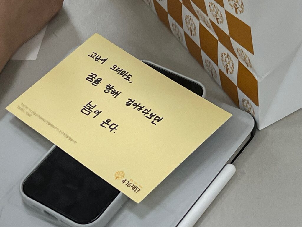 내 꿈과 친구의 꿈을 응원하다가도, 어느 날은 꿈을 향하는 시간이 힘들게 느껴지기도 할 거예요. 4.16재단은 그 시간까지도 응원하고 싶습니다. 넘어지거나 앉아 있어도 괜찮습니다. 천천히 끝까지 완주하길 응원하며 재단도 최선을 다하겠습니다."