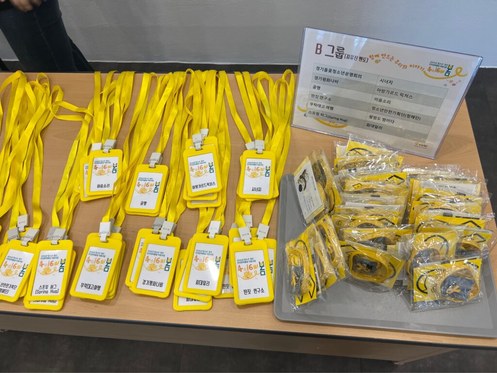 경기도미술관 강당으로 이동하면 따뜻함이 느껴지는 노란 배너들과 명찰, 배지 등이 준비되어 있습니다. 그리고 안내를 도와주시는 관계자 분들이 계십니다.