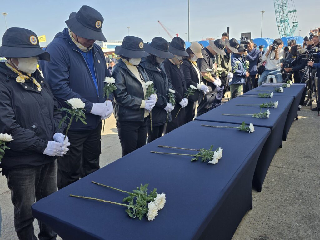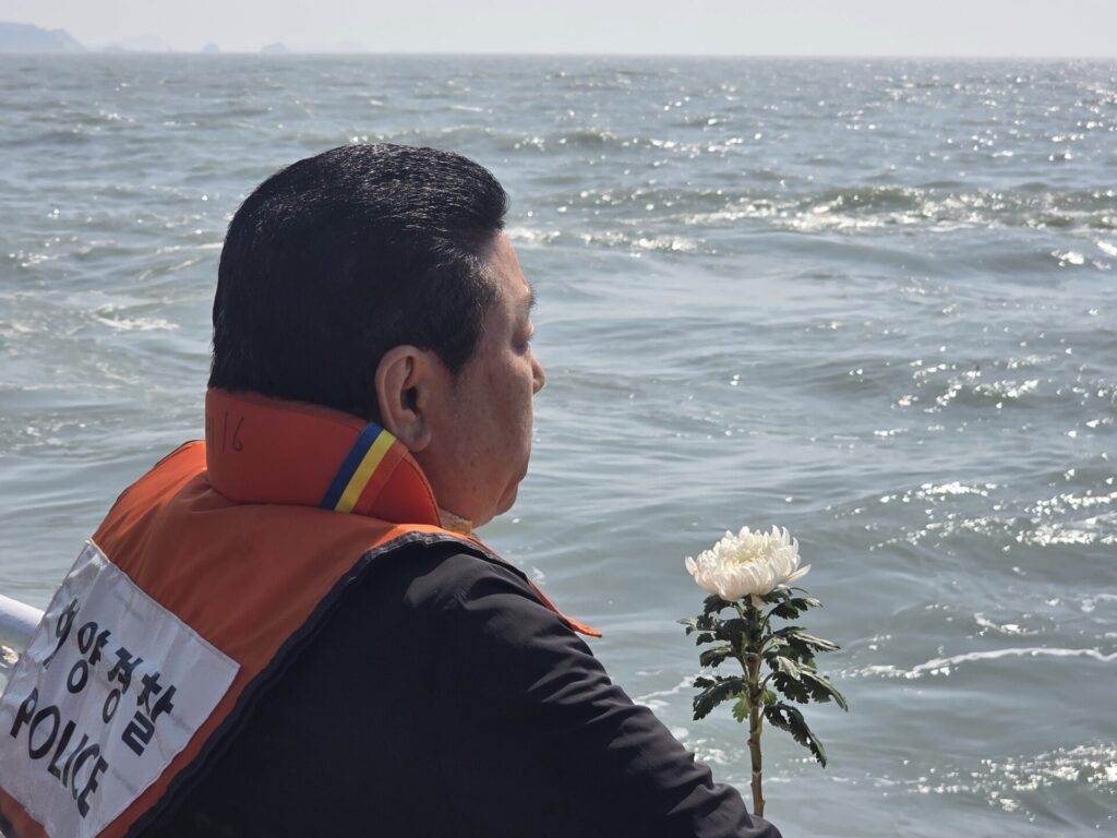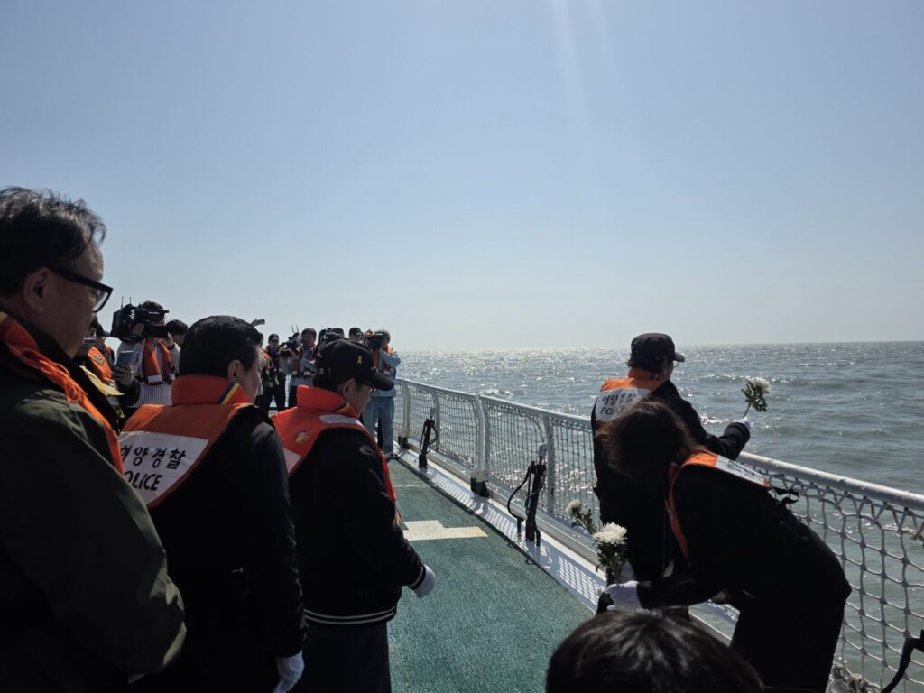 참석자는 부표를 향해 헌화했습니다. 헌화는 선상추모식 식순 중 가장 애달프고 슬픈 순간이었습니다. 모두가 저마다 다른 방식으로 애도했습니다. 말 없이 국화를 두 손 꼭 잡거나, 말을 못 다 잇고 흐느끼거나, 가슴에 묵혀둔 말을 쏟아냈습니다. 차마 헌화를 하지 못하는 이도 있었습니다.