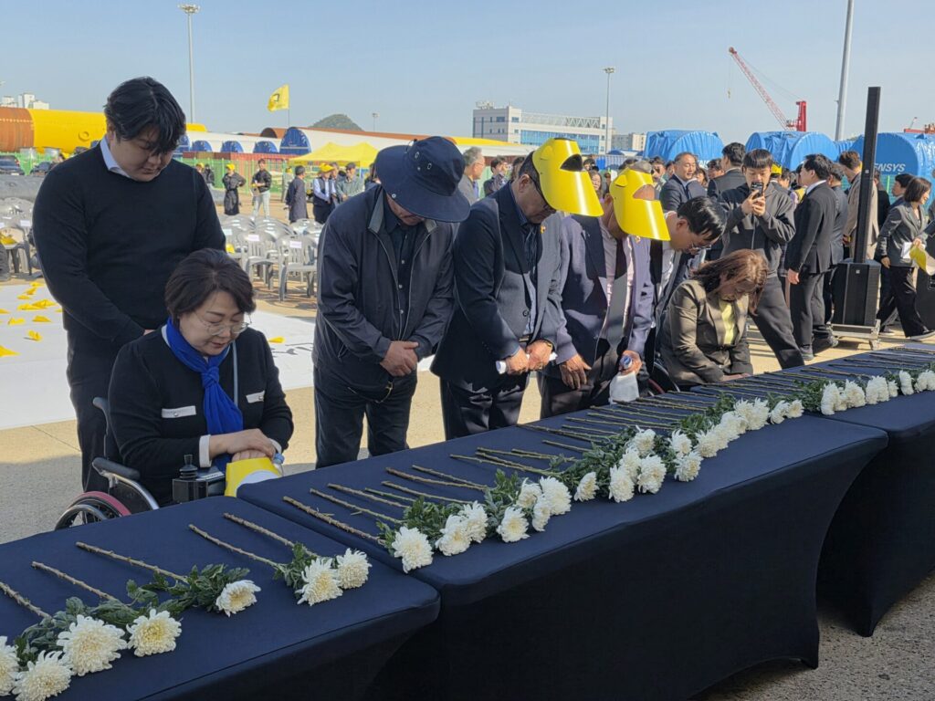 마지막에는 참여자 전원이 노란 종이비행기를 함께 날리고, 추모헌화를 했습니다. 비행기와 하얀 국화에 담긴 지지와 연대의 마음이 계속 이어지기를 바랍니다.
