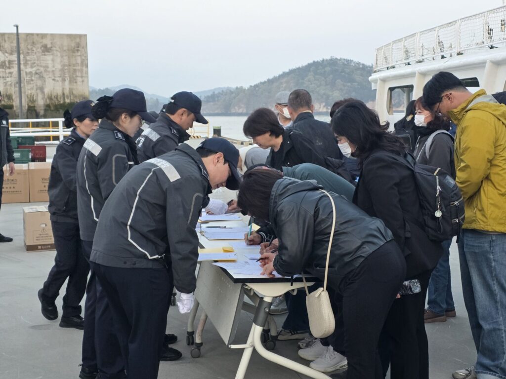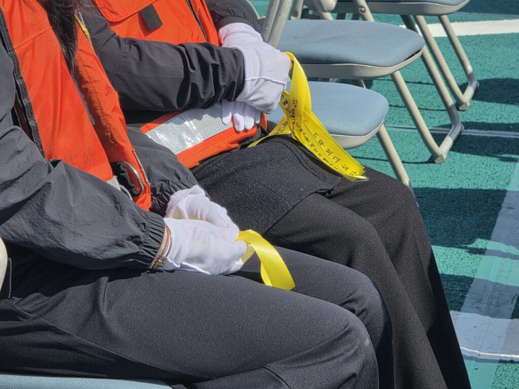 참석자들은 새벽 1시에 안산시 단원구에 모여 함께 목포로 출발했고, 6시에 목포항에서 출항하는 1508번 해경 경비함에 탑승했습니다. 노란 리본을 쥐고, 국화 한 바구니를 꼭 쥐고는 배에 올랐습니다. 다친 다리를 이끌고 진도로 향한 단가협 어머님도 계셨습니다.