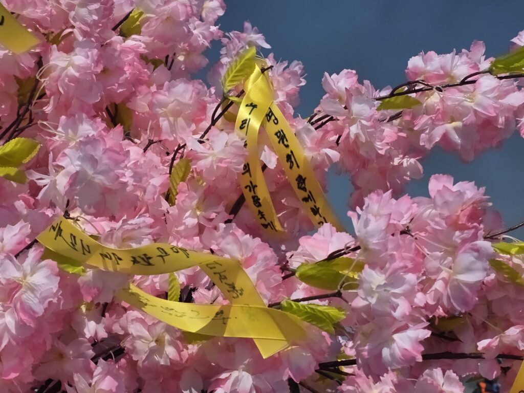 참석자들은 벚나무에 노란 리본을 다는 추모 의식을 치렀습니다. 노란 리본에는 유가족의 그리움과 다짐이 담겨 있습니다.