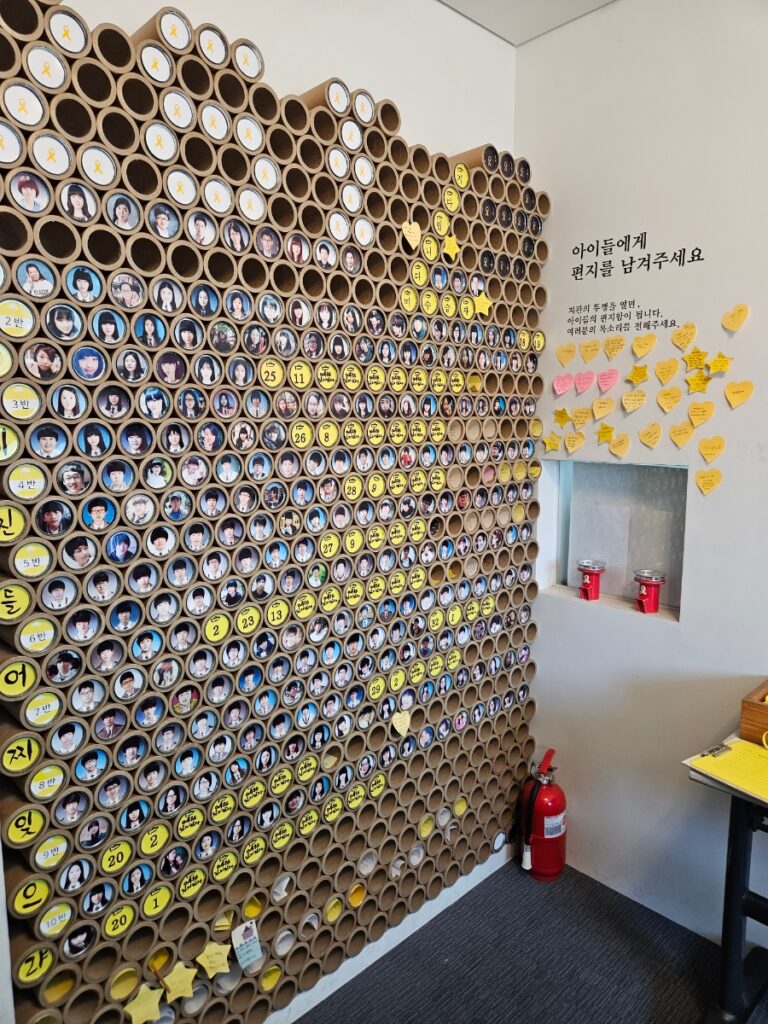 우선 전시관 입구에 들어서면 종이 지관들을 볼 수 있습니다. 지관통 겉면에는 아이들의 사진이 있고 그 안에 뚜껑을 열어보면 직접 적은 메시지, 편지를 넣을 수 있도록 만들어져 있습니다.