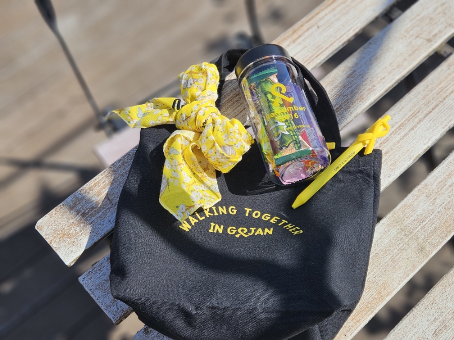 <같이걷자> 탐방을 나서기 전, 참여자들에게 ‘기억굿즈’를 제공해 주었습니다. 소지품을 담기 좋은 미니 에코백과 그 안에 간식이 담긴 텀블러, 그리고 볼펜과 손수건까지 다양한 굿즈들을 준비해 주셨습니다.