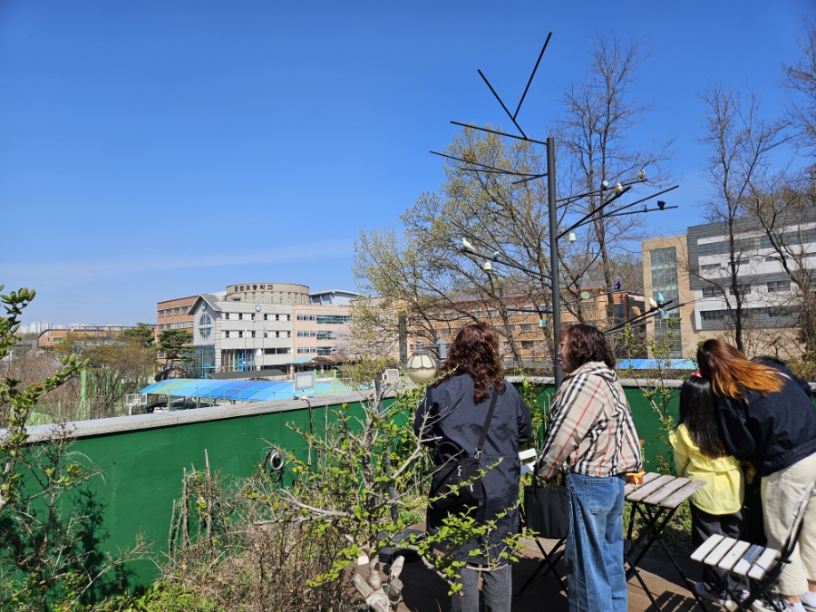 첫 번째 코스는 같은 건물 옥상, <온유애뜰>에서 시작되었습니다. 과거 평범한 옥상이었지만 세월호 참사 이후 같은 건물에 있는 교회에서는 희생된 아이들을 위하여 정성을 아끼지 않았고 이에 감사한 마음에 양온유 학생의 부모님께서 기부금을 전달하여 이렇게 예쁜 꽃들과 함께 테라스가 구성된 공간이 되었다고 합니다. 편안하게 휴식을 얻길 바라는 염원이 담겨있습니다.