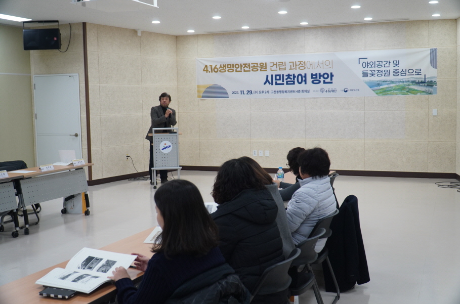 지난 11월 29일, 안산 단원구 고잔동행정복지센터 4층 대강당에서 ‘4.16생명안전공원 포럼’이 성황리에 진행되었습니다. 이번 포럼은 발제 및 토론을 통해 4.16생명안전공원 건립 과정에서 야외공간과 들꽃정원에서 시민참여 방안 논의를 하고자 하기 위함입니다. 이번 논의는 4.16생명안전공원에서 들꽃정원의 의미와 10주기를 맞이하며 시민과 함께 만들어가는 생명안전공원에 대해 발표와 토론이 진행되었습니다.