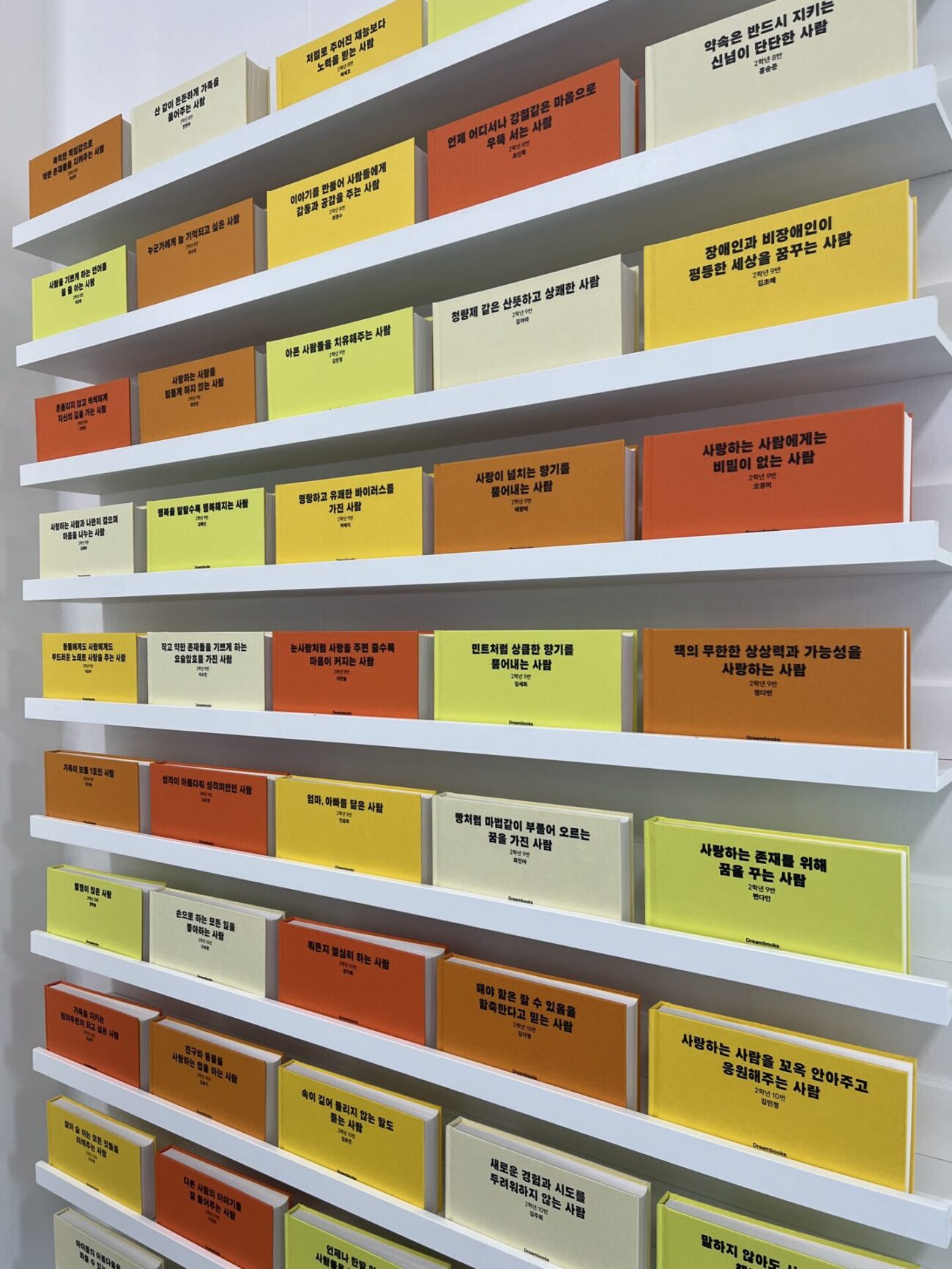 -저 역시 이번 전시를 준비하며 많이 생각해봤어요. 전시된 책을 펼치면 첫 장에 한 아이가 다른 아이에게 꿈을 묻는 글이 있습니다. 거기에 꿈에 대해 질문을 받는 아이가 이렇게 대답해요. “무모하지 않은 용기, 그렇지만 갖고 있는 용기가 너무 흔해서 언제든 사람들에게 쓸 수있는 용기가 있는 사람.” 그런 사람이 되는 것이 저의 꿈이라 할 수 있을 것 같습니다. 누군가에게 사랑한다고 말하는 것도 용기가 필요하고, 잘못된 것을 보고 잘못되었다고 말하는 것도 용기가 필요한 것 같아요. 대단하진 않더라도 그런 용기가 많은 사람이 저의 꿈입니다.