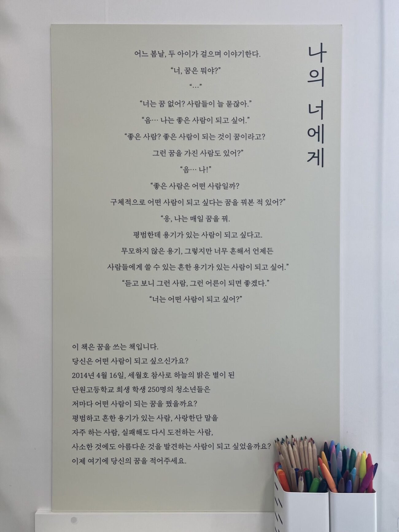-4.16꿈숲학교는 250명의 단원과 희생자들을 기억하며 지금을 살아가는 청소년과 청년들을 위한 공간입니다. 그래서 10주기를 통과하는 지금, 우리가 꿈에 대해 이야기할 때 조금은 다른 관점의 꿈을 이야기해보면 좋겠다고 생각했습니다. 어떤 구체적인 직업을 꿈으로 단순하게 생각하기보다는 어떤 직업을 갖던 사람으로서의 꿈을 이야기해보고 싶었습니다. 세월호참사 이후 재정비된 기억교실에 가서 제가 가장 미안함을 느끼고 눈물을 흘렸던 곳이 있는데요. 바로 수도권 대학 리스트가 있는 교실의 게시판이었습니다. 저는 세월호참사가 한국사회를 전면적으로 다시 바라봐야 하는 중대한 지점을 만들었다고 생각했어요. 기억교실이 있는 건물 1층에는 아이들이 체육대회에서 웃고 춤추는 모습, 장난치는 모습이 있는데 교실 안에 수도권 대학 리스트와 대조적으로 느껴졌습니다. 세월호 참사 이후, 희생자들에게 미안하기만 했던 부분이 지금을 살아가는 학생들에게도 그대로 적용되는 것 같아 어른으로서 반성하게 되었습니다. 모두가 대학에 가야 하고 사회에서 인정받는 직업을 가져야 성공하는 것이라는 편협하고 협소한 사회적 인식이 변해야 한다고 생각했습니다.