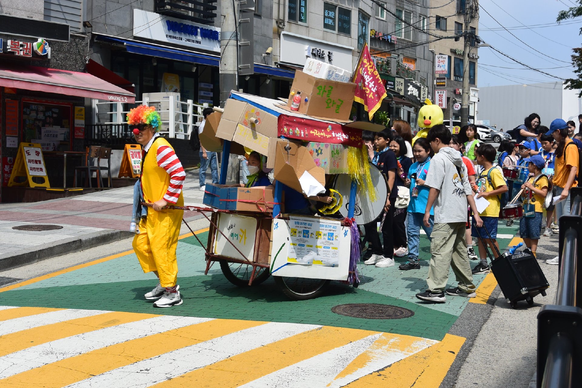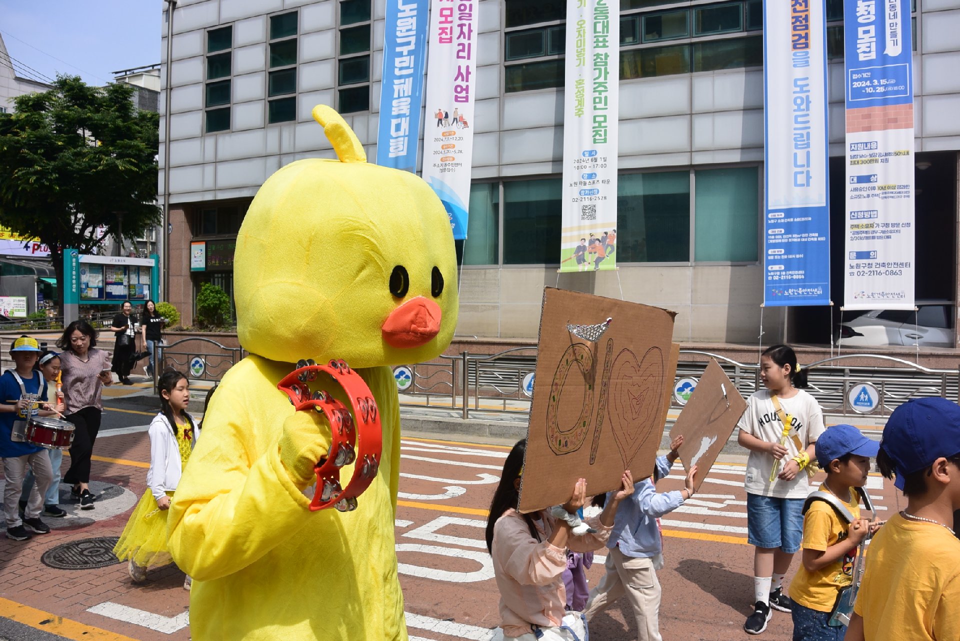 오전 10시쯤 공릉청소년문화정보센터와 다운복지관에서 퍼레이드를 시작했다. 두 장소에 각각 퍼레이드 인원들이 같이 합쳐서 축제 현장으로 가는 과정이다. 이 퍼레이드는 공릉동꿈마을공동체가 근처 주민과 아이들의 참여로 만들어 왔다. 서울은 물론 타 지역의 어린이들이 직접 판넬을 만들고, 북소리에 맞춰서 줄지어 가는 행사다. 더웠음에도 불구하고 아이들은 씩씩하고 즐겁게 참여하였다.