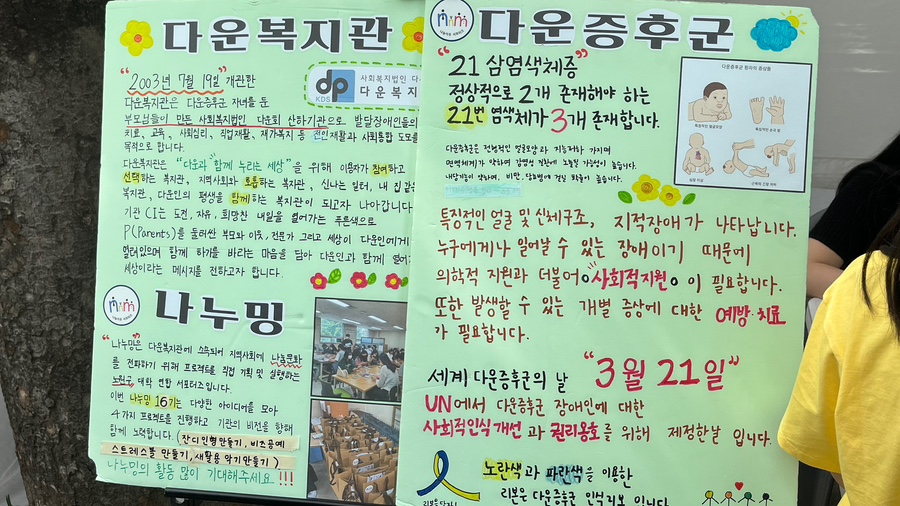 본격적인 행사 과정에 대해 이야기하기 전 다운증후군에 대한 이야기를 해보겠다. 다운증후군은 본래 있어야 할 21번 염색체가 2개가 있어야 하는데, 3개가 존재해 지적 장애, 신체 기형 등을 일으키는 유전질환이다. 정확한 국내 통계는 없으나 일반적인 유병률은 신생아 600~700명 당 한 명꼴로 태어난다고 한다. 이에 매년 3월 21일은 세계다운증후군의 날로 지정해 다운증후군 환자에 대한 사회적인 인식 개선과 권리를 옹호한다.