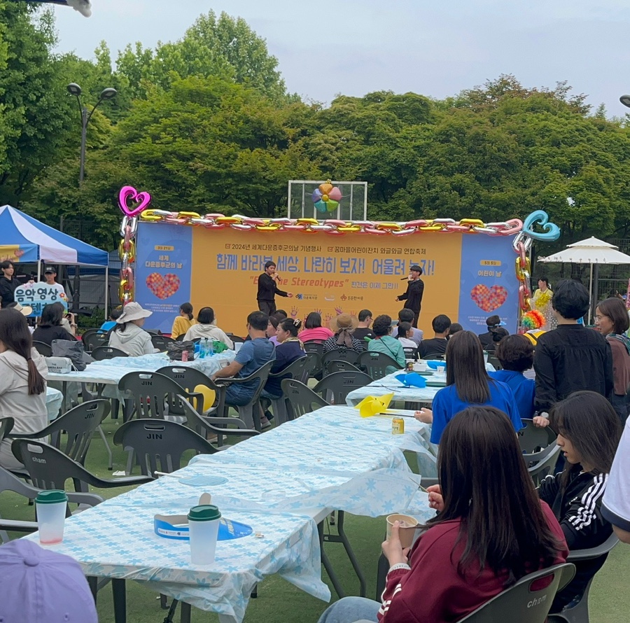 5월 25일 토요일, 햇빛이 내리 쬐는 하늘 아래 화랑대역 5번 출구 근처 공릉근린공원에서 <꿈마을어린이잔치 와글와글 연합축제>가 진행됐다. 해당 축제는 다운복지관이 2024년 세계다운증후군의 날과 어린이날을 기념하여 매년 5월마다 진행하는 것으로, 다운증후군에 대한 올바른 사회적 인식을 개선하고 장애인과 비장애인이 하나로 통합할 수 있는 화합의 기회를 마련하기 위해 기획됐다.
