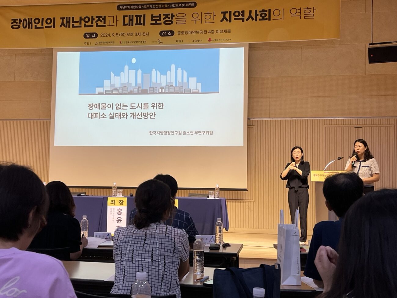 2024년 9월 5일 재난약자지원 <모두가 안전한 마을> 사업 보고 및 토론회가 종로장애인복지관에서 진행되었다. 2022년부터 종로장애인복지관에서는 종로구 장애인의 안전생태계 구축 프로젝트를 기획 및 진행하고 있다. “재난은 평등하게 다가오지 않고 사회적 취약계층에게 먼저 다가왔습니다.” “발달장애인과 그 가족의 삶이 반지하입니다.”라는 2022.8.18 폭우 희생자 시민분향소에서 전국장애인부모연대 기자회견 중에 나온 이야기들이 이 프로젝트 추진의 배경이 되었다. 재난 및 안전관리 기본법에 장애인은 안전 취약계층에 포함되어 있지만, 재난 시에 그들을 위한 지원 방안이 마련되지 않은 현실을 해결하고자 이 사업이 시작되었다. 따라서 이 사업은 종로구 장애인 재난 대응 수준 점검 및 유관기관 연대를 통한 안전한 생태체계를 구축하는 것을 목적으로 한다.