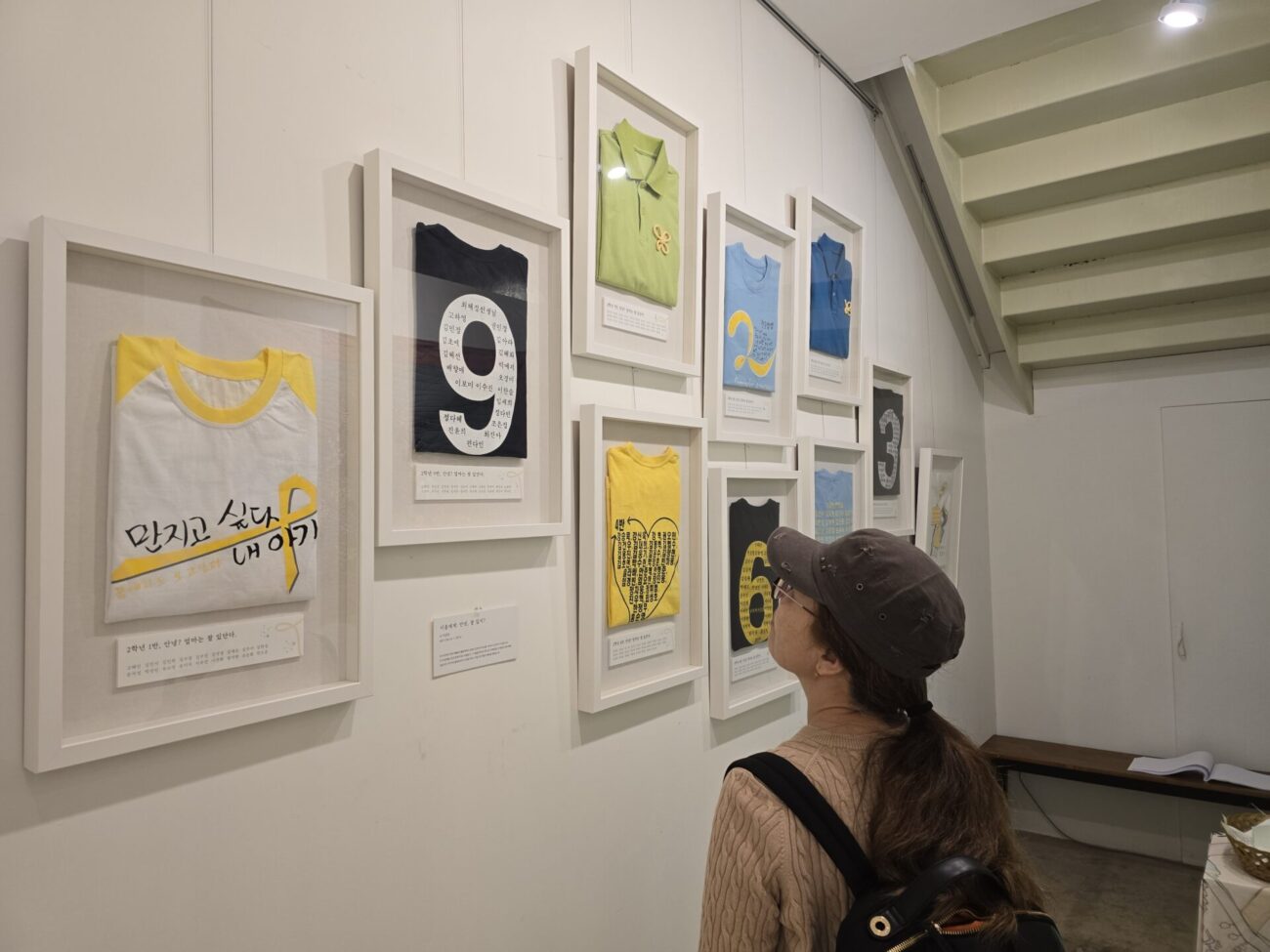 또한, ‘이름에게: 안녕, 잘 있지?’라는 제목의 작품도 소개됐습니다. 해당 작품은 유가족들이 2014년부터 활동하며 실제로 입었던 반별 티셔츠를 1반부터 10반까지 모은 것으로, 티셔츠에는 잊지 말아야 할 이름들과 그 이름을 지키기 위한 가족들의 땀이 배어 있습니다. 작품 제목은 아이들에게 안부를 전하듯 마음을 담아 붙인 것입니다.