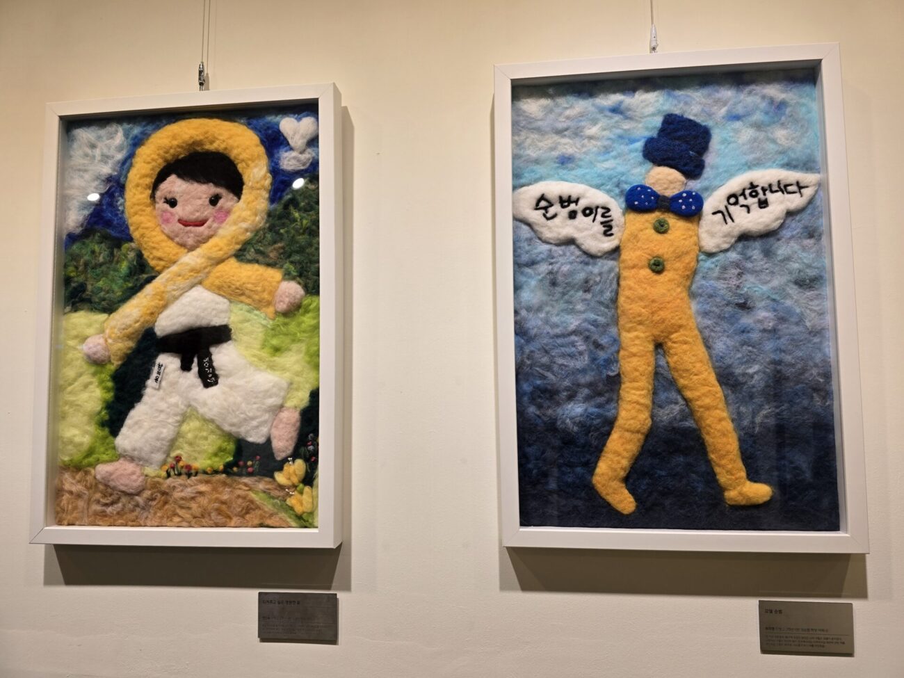 2학년 6반 권순범 학생의 어머니(최지영)는 아들의 꿈을 담은 ‘모델 순범’을 선보였습니다. 패션에 많은 관심을 보였던 아들의 모습을 모델로 표현한 해당 작품은, 기억 속 아들이 계속 꿈을 펼쳐나가기를 바라는 어머니의 간절한 마음을 담고 있습니다. 이와 함께 전시된 태권도 사범의 모습을 담은 작품 역시, 아이의 관심사를 바탕으로 제작된 추모의 작업입니다.