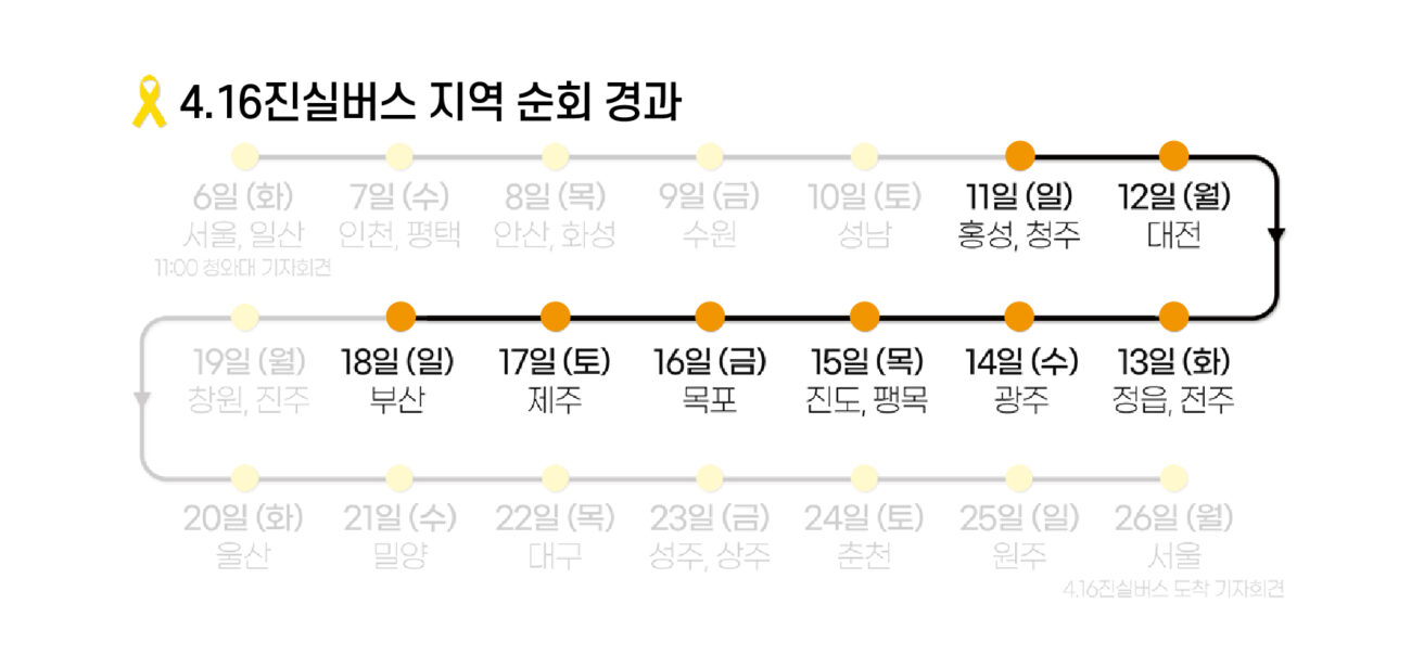 ‘4.16 진실버스’는 세월호참사 7주기까지 진상규명을 위해 세월호 엄마, 아빠들이 직접 전국을 순회하며 시민들을 만나 이야기를 나누며 연대 의지를 다지는 전국 대장정입니다. 엄마, 아빠는 28개 도시, 3.100km, 21일 간의 기나긴 일정을 지난 6일 출발했습니다.