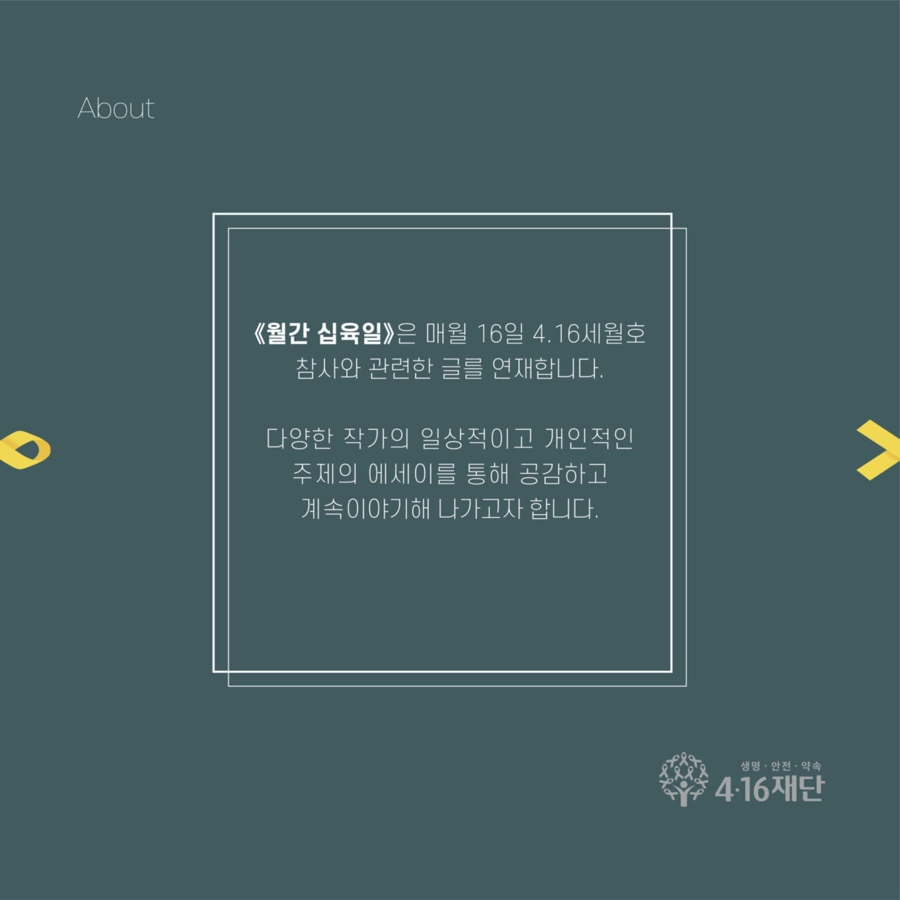 《월간 십육일》은 매월 16일 4.16세월호참사와 관련한 에세이를 연재합니다. 다양한 작가의 일상적이고 개인적인 주제의 에세이를 통해, 공함하고 계속 이야기해 나가자고 합니다.