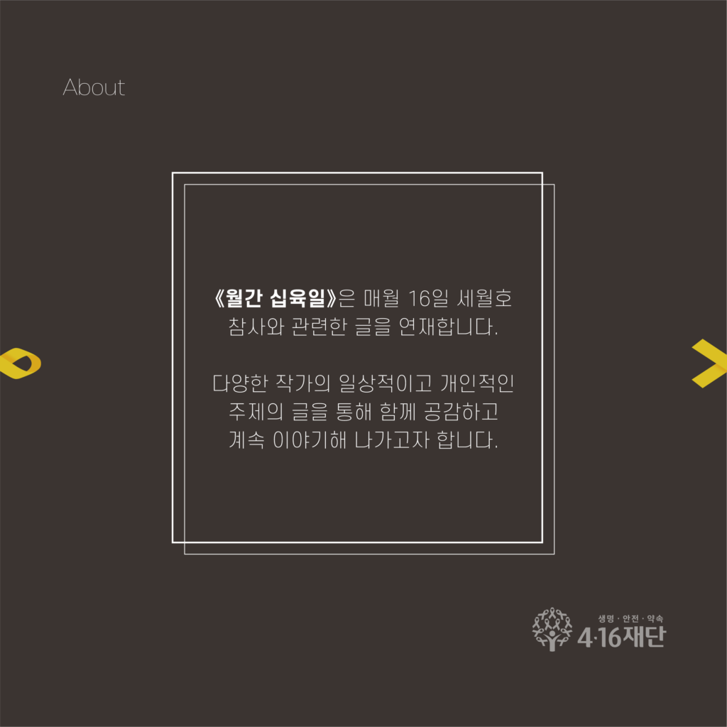 《월간 십육일》은 매월 16일 4.16세월호참사와 관련한 글을 연재합니다. 다양한 작가의 일상적이고 개인적인 주제의 글을 통해 함께 공감하고 계속 이야기해 나가자고 합니다.
