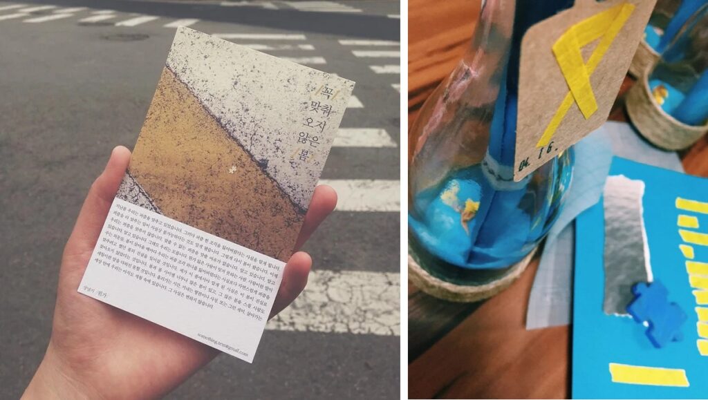 2016년 봄. 검은 아스팔트 위에 떨어진 또 다른 퍼즐 한 조각을 발견했다. 파고가 높아진 바다를 닮은 짙푸른 색감이었다. 사람의 발이나 차바퀴에 맞고 굴렀는지 플라스틱으로 만들어진 퍼즐이 온통 긁혀 있었다. 그 길에서 주워온 퍼즐 한 조각을 본떠 종이를 오리고 편지를 써서 유리병에 넣었다. 책방 사장님이 한쪽 벽면을 내어주셔서 “416 유리병편지”라는 이름으로 얼마간 연남동 헬로인디북스에 둘 수 있었다.