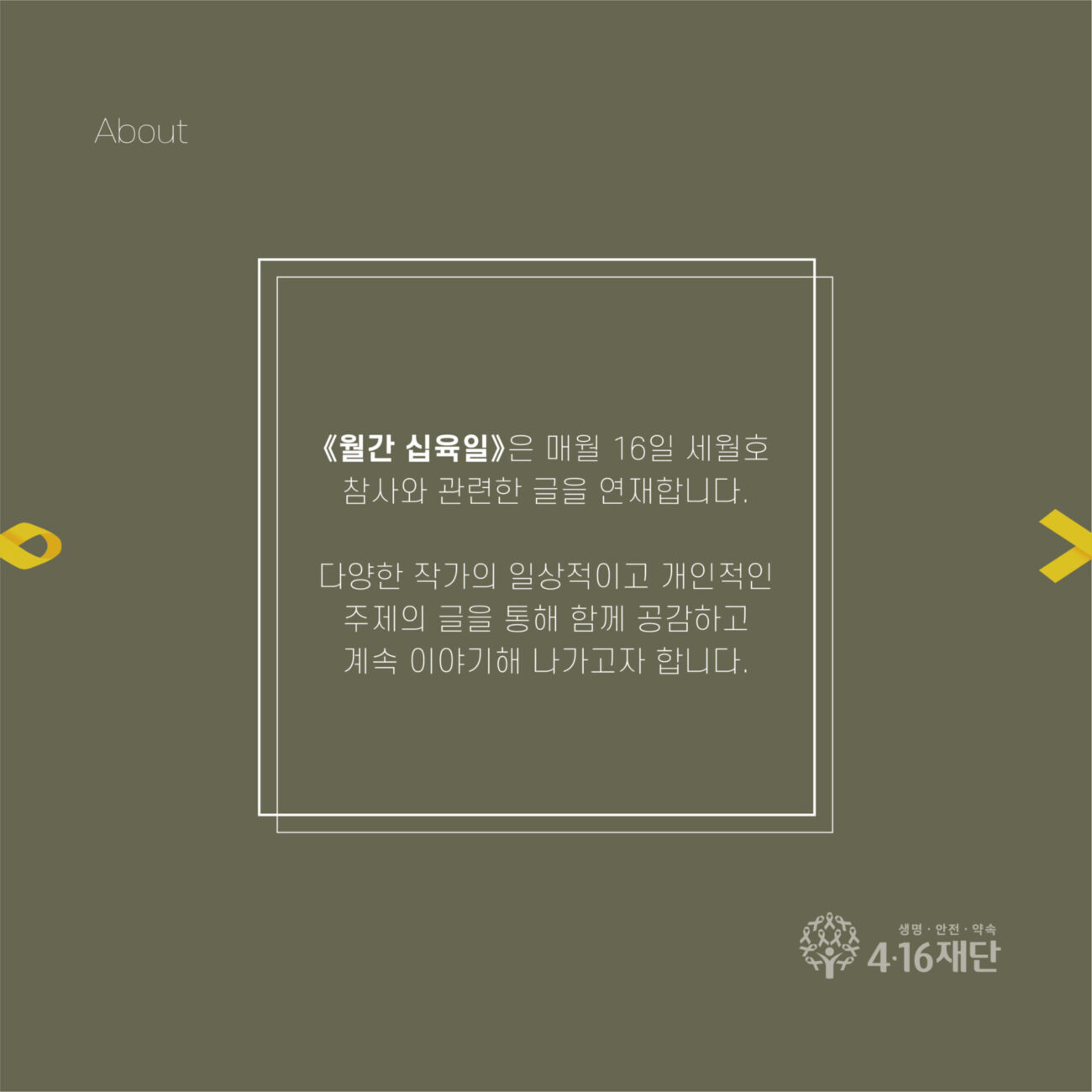 《월간 십육일》은 매월 16일 4.16세월호참사와 관련한 글을 연재합니다. 다양한 작가의 일상적이고 개인적인 주제의 글을 통해 함께 공감하고 계속 이야기해 나가자고 합니다.