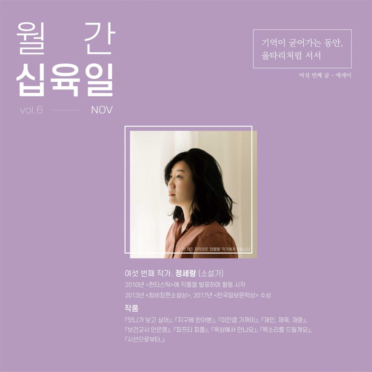 십일월의 월간 십육일에서는 2010년 <판타스틱>에 작품 발표를 시작으로, <창비장편소설상>, <한국일보문학상> 등을 수상하며 활발한 작품 활동을 이어가시는 정세랑 작가님의 에세이를 소개합니다.