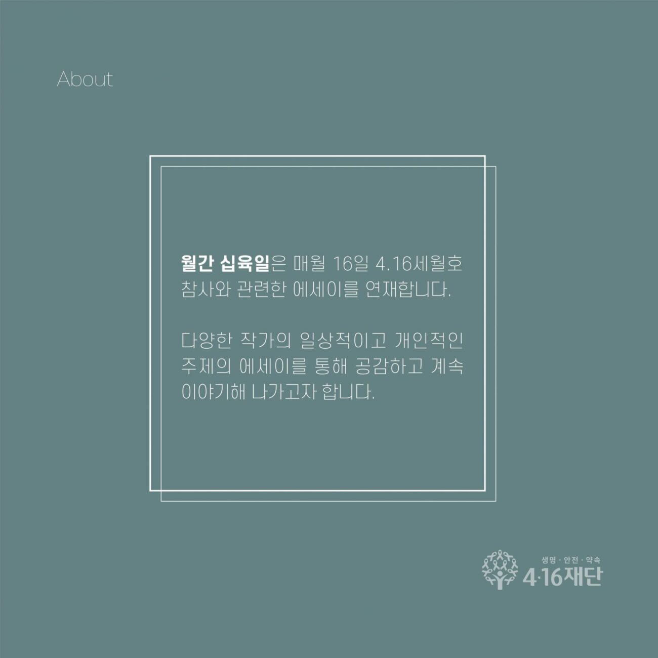 월간 십육일은 매월 16일 4.16세월호참사와 관련한 에세이를 연재합니다. 다양한 작가의 일상적이고 개인적인 주제의 에세이를 통해, 공함하고 계속 이야기해 나가자고 합니다.
